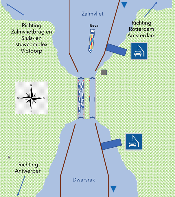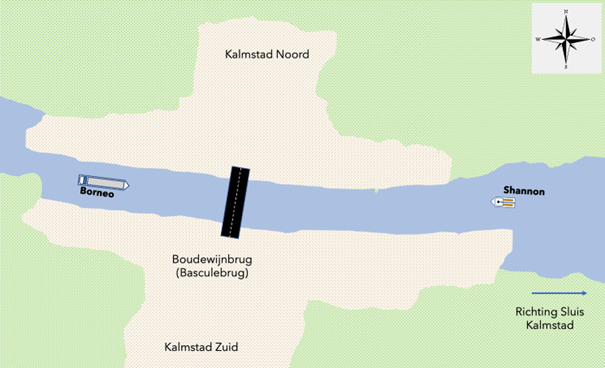 #50. Je hebt avonddienst op de bediencentrale Aalburg aan de Verlaat. Het is windstil en er loopt geen stroming. Twee binnenvaartschepen hebben zich gemeld voor een opening van de Boudewijnbrug. Je gaat de brug bedienen, hoe ga jij bepalen welk schip het eerst door de brug mag? (3 punten)