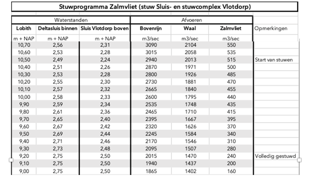 #52. Hierboven zie je een deel van het stuwprogramma Zalmvliet. In de eerste kolom zie je de waterstand bij Lobith. In de tweede kolom zie je de waterstand bij de Deltasluis binnen. Wat zal de waterstand worden bij de Deltasluis binnen als bij Lobith de waterstand zakt van +NAP 9,20 naar +NAP 8,20? (2 punten)