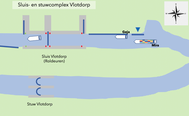 #44. Je hebt ochtenddienst en je bedient Sluis Vlotdorp. Je hebt een afschutting met de Mira in de bovenkolk. Je hebt net tegen de Mira gezegd dat hij moet afmeren aan bakboord. Dan meldt de Geja dat hij gaat vertrekken van de wachtplaats boven de sluis en een schutting wil naar beneden. Qua afmetingen kunnen beide schepen naast elkaar in de sluis. Hoe luidt je melding aan de Geja? (3 punten)