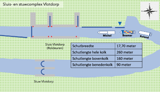 #57. Je werkt op sluis Vlotdorp en je hebt enkel de bovenkolk tot je beschikking wegens onderhoud aan de benedendeuren. Je hebt dus een schutlengte van 160 meter en een schutbreedte van 17,70 meter. Voor je sluis liggen vier schepen die naar beneden willen schutten. In volgorde van toerbeurt: