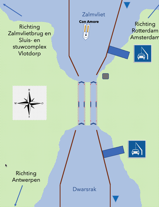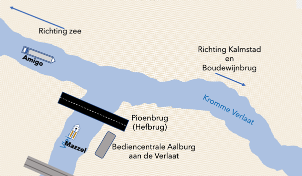 #7. Je bent de Pioenbrug aan het bedienen voor zeiljacht Mazzel. In dezelfde brugopening zal het binnenvaartschip Amigo door de brug varen. Je wilt de Mazzel op de hoogte stellen van de Amigo. Wat is de juiste manier om de Amigo te positioneren? (2 punten)