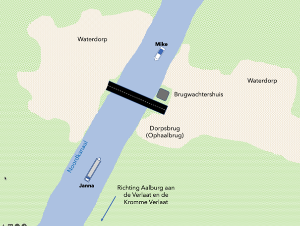 #40. Je bent de operator van de Dorpsbrug en hebt net de scheepvaartverkeersseinen op rood-groen gezet om het binnenvaartschip zuid van de Dorpsbrug een opening te geven. Dan krijg je de volgende oproep: “Dorpsbrug dit is zeiljacht Mike, 800 meter noord van de brug verzoek een opening, over.” Hoe luidt het correcte antwoord aan de Mike? (3 punten)