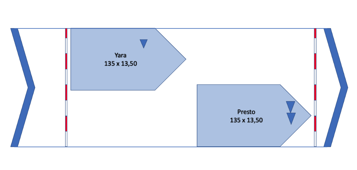 #29. Je werkt op de Deltasluizen en je wilt twee schepen schutten. De sluis heeft een schutlengte van 309 meter en een schutbreedte van 23,70 meter. Je hebt een schutplanning gemaakt met het binnenvaarttanker Yara met één blauwe kegel en de binnenvaarttanker Presto met twee blauwe kegels zoals in de bovenstaande afbeelding. Mag je deze schepen ook zo schutten? (3 punten)
