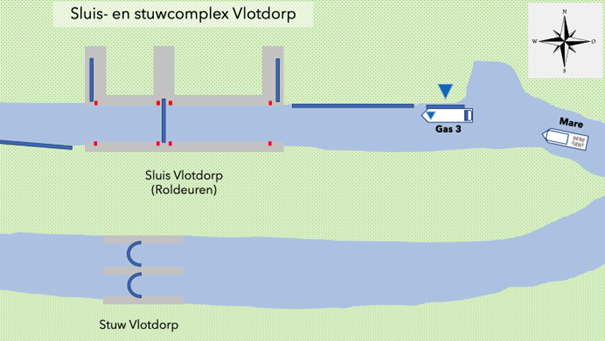 #46. Je bedient Sluis Vlotdorp. Twee minuten geleden heeft passagiersschip Mare zich gemeld voor zijn toerbeurt. De Mare heeft 16 passagiers aan boord en wil naar beneden schutten. Dan meldt de Gas 3 zich aan de kegelplaats voor een schutting naar beneden. De schepen passen qua afmeting bij elkaar in de bovenkolk. Hoe ga je deze schepen schutten? (3 punten)